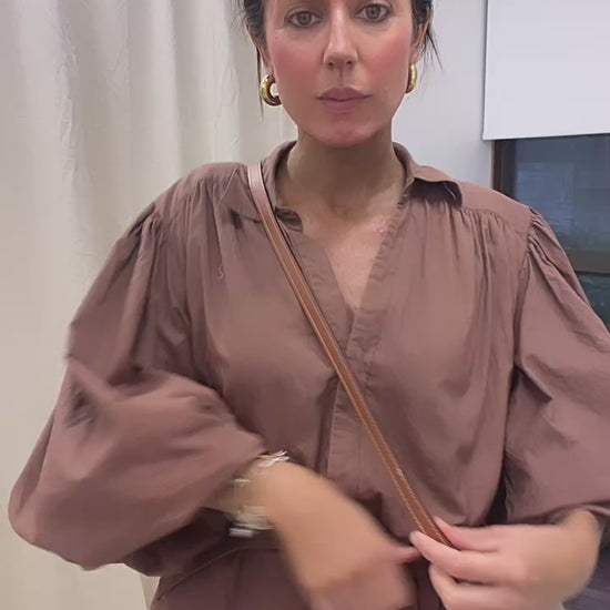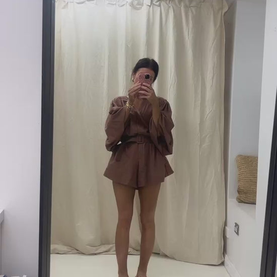 The kind of piece that does polished and playful in equal measure. The Freya Romper is made from a rich brown cotton, soft yet structured, with billowing long sleeves that gather at the wrist with an elasticated cuff. A button-up front and neat collar add tailored simplicity, while the separate quilted belt allows you to define the waist, or wear it loose for an undone look. Designed for movement, styled with intention.