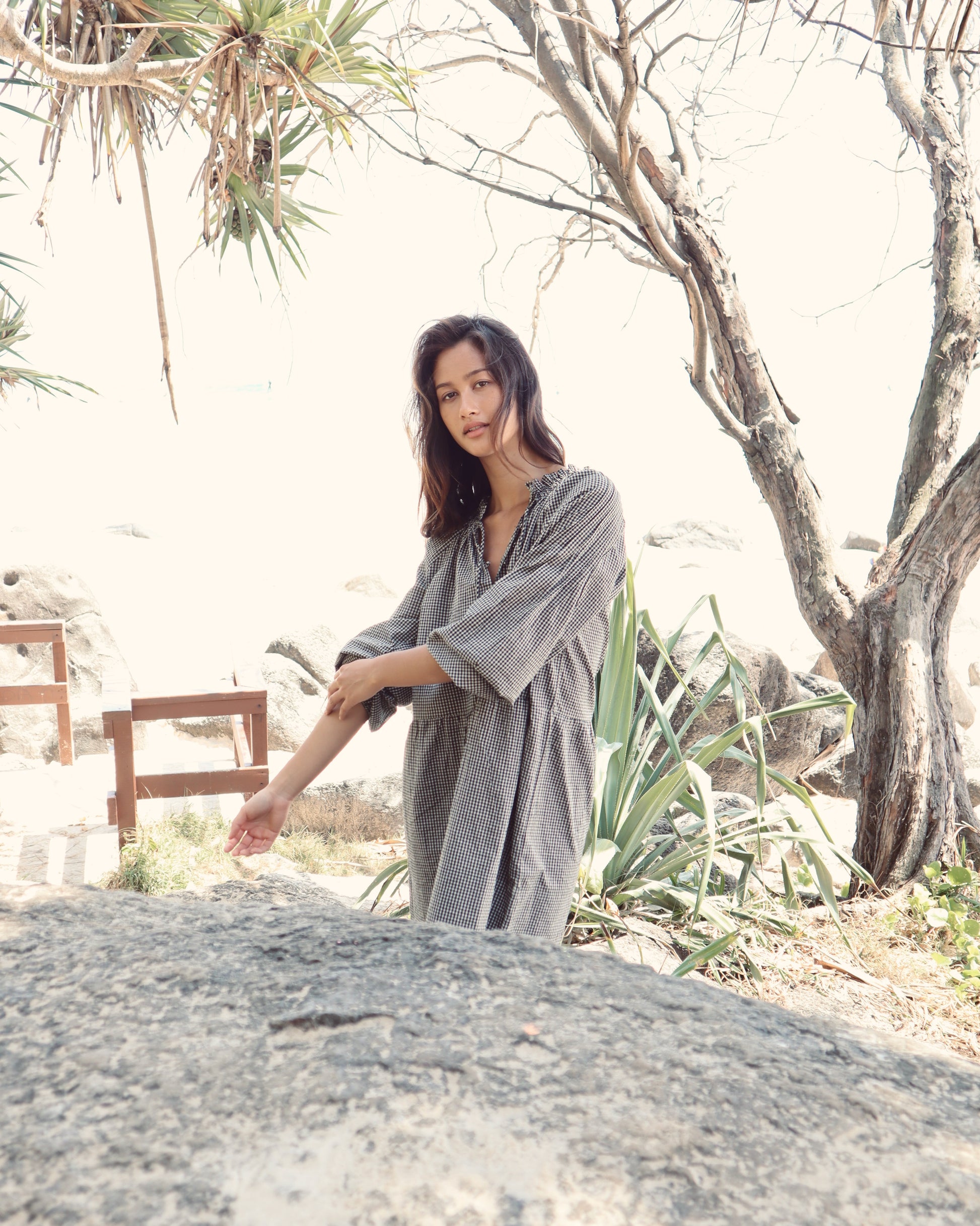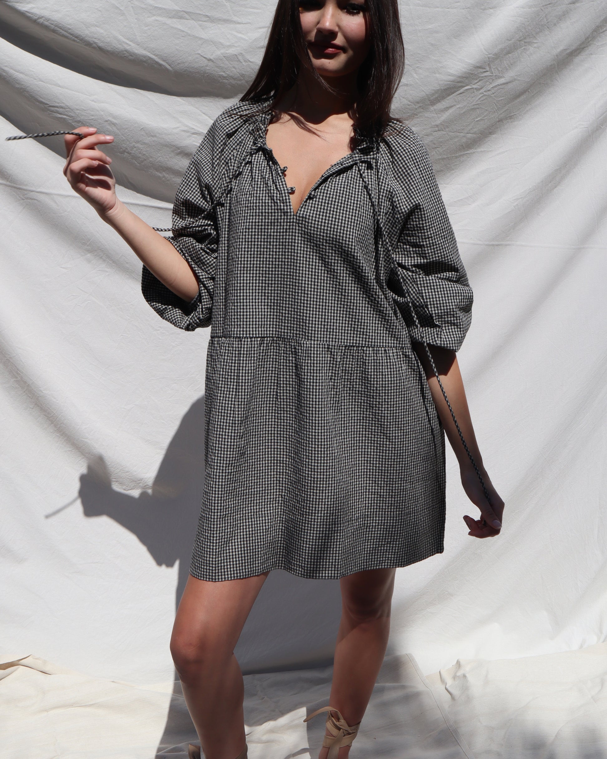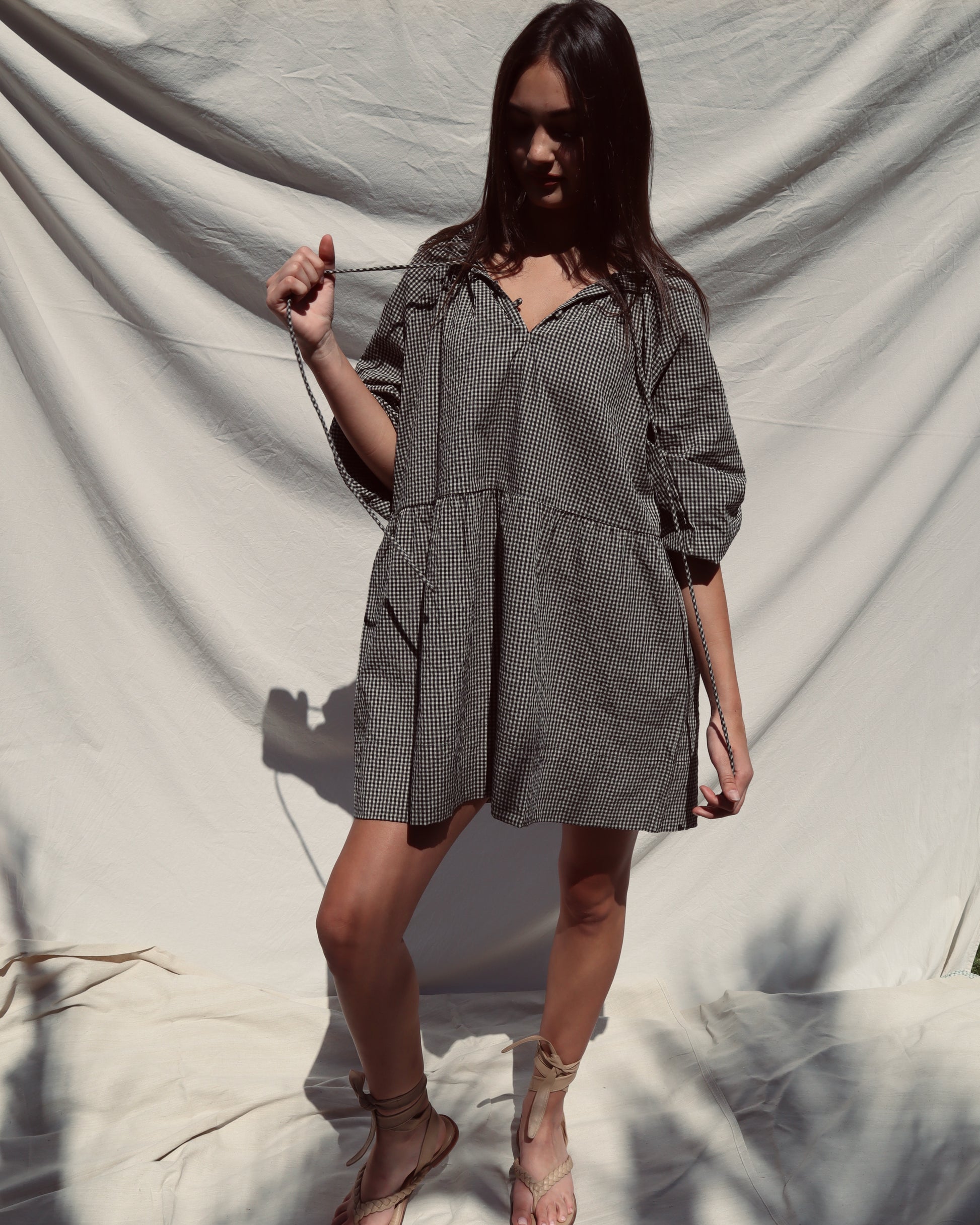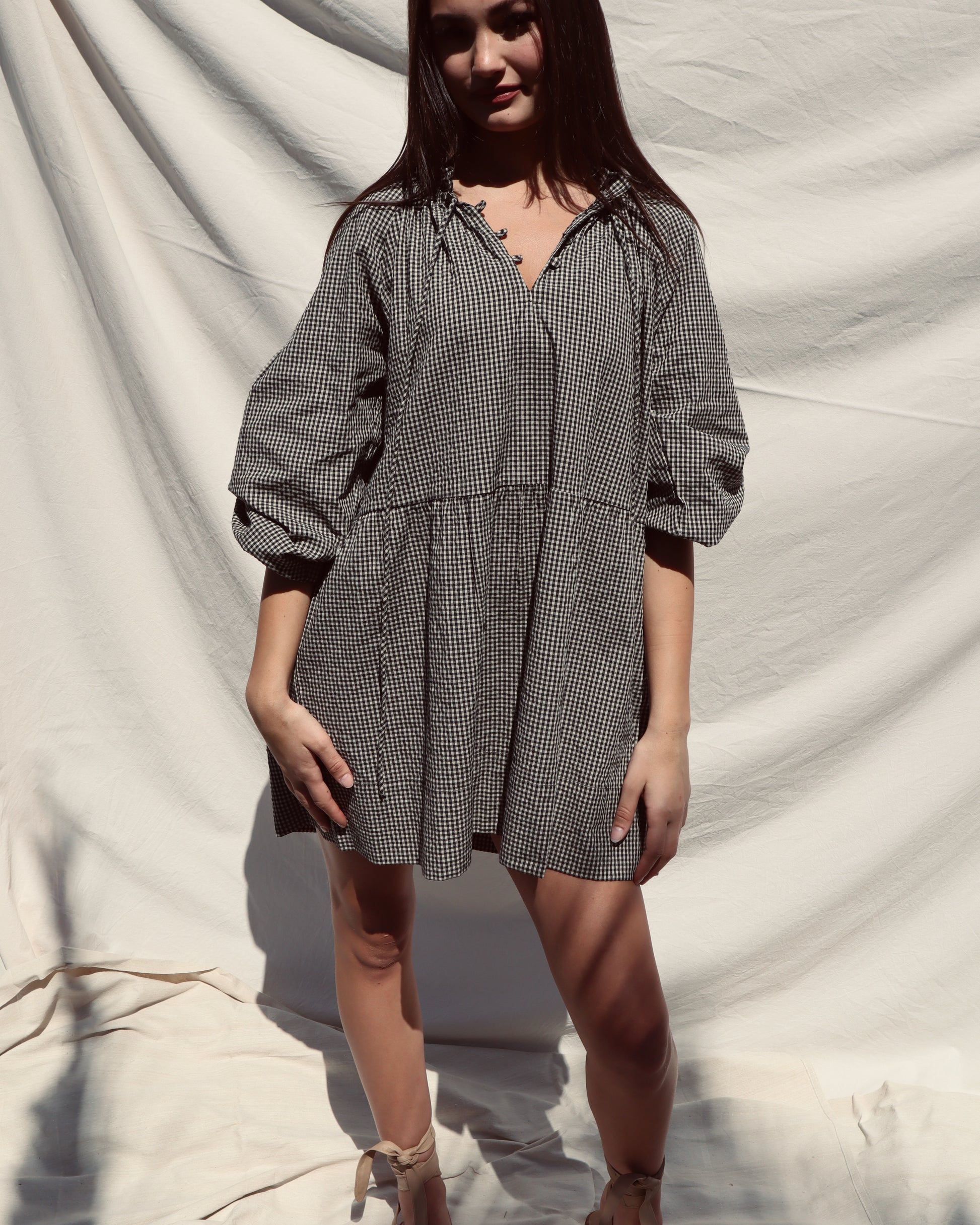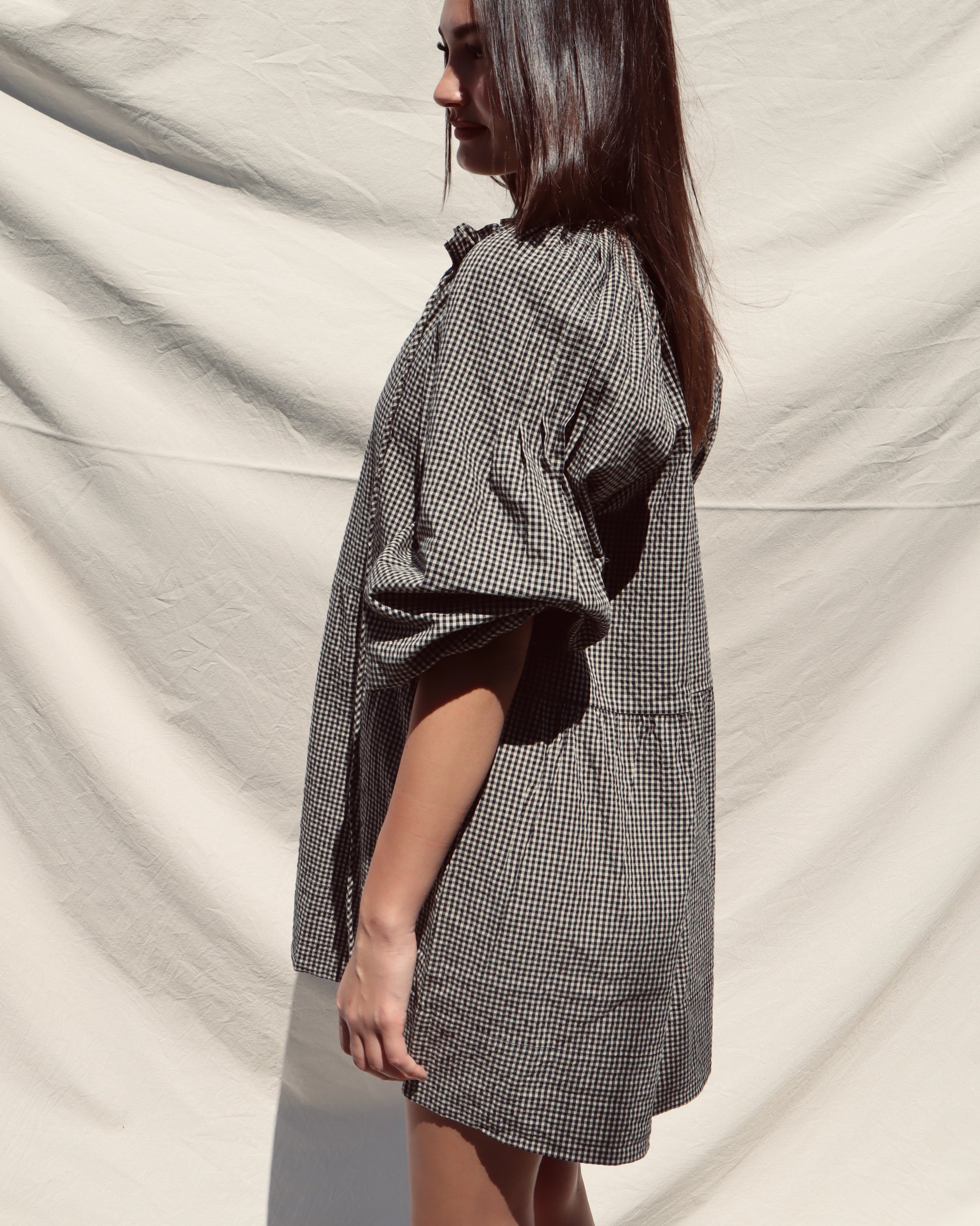 The Gabriella Dress is an elevated everyday piece designed for ease and versatility. Crafted from 100% cotton in a classic gingham check, it combines comfort with thoughtful detailing.