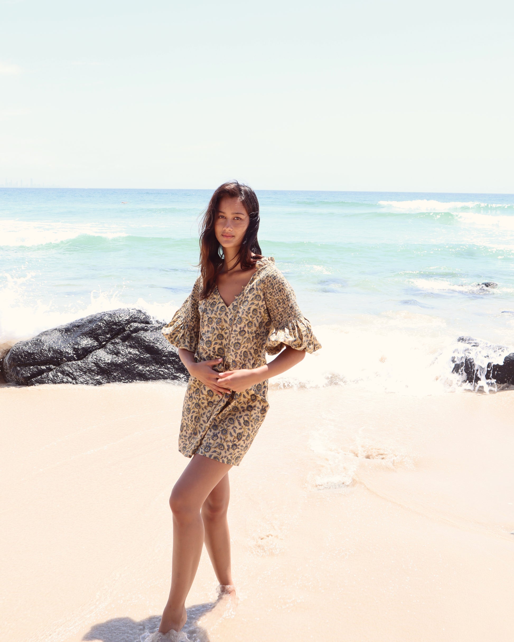 Softly structured, feminine and effortless. Sitting just above the knee, Rocky features a relaxed silhouette brought to life with a rope waist tie so you can shape her as much or as little as you like. Shirred detailed shoulders, a gentle frill at the collar and a flattering V-neckline give her that subtle Louley romance, while the breathable lining and soft drawstrings keep her beautifully wearable. A warm-weather staple in our exclusive print.