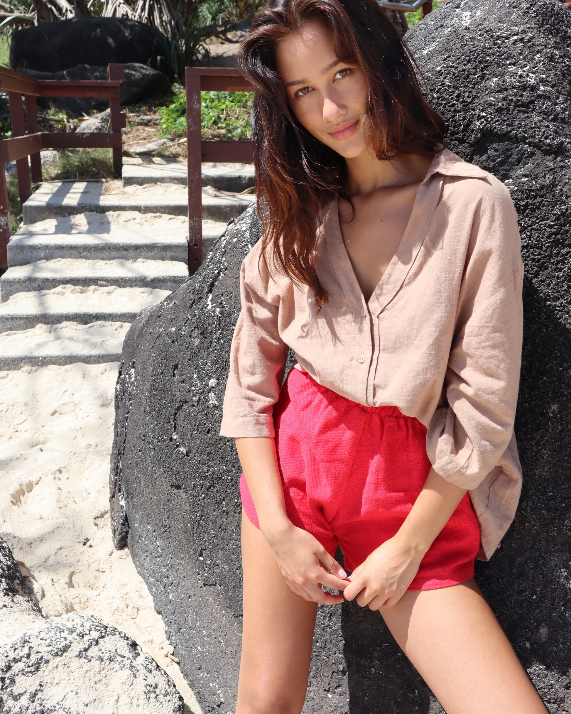 Easy to wear, effortless to style. The Tala short have been crafted from 100% pure cotton in a textured red colour. Made for comfort and the transition of day to day life. Featuring an elastic waist band that can be worn higher for a high waisted look or pulled down for the right fit for you. Adorned with pockets either side these shorts are an everyday, easy and effortless go to pant.