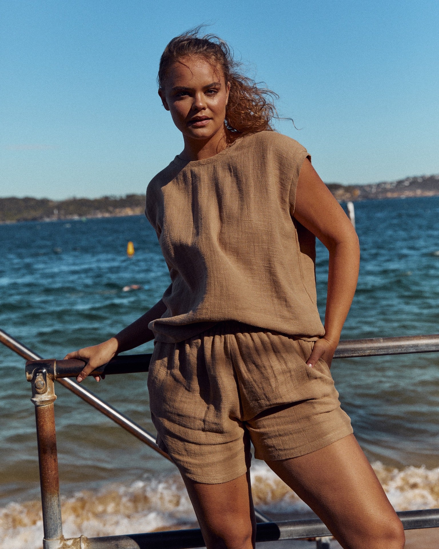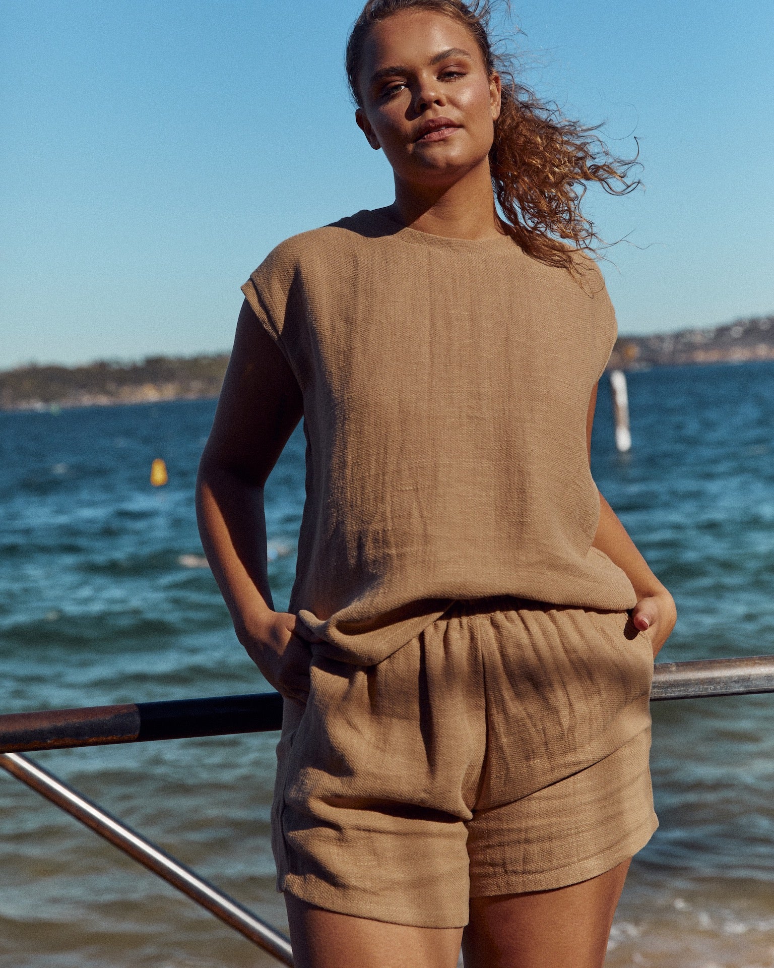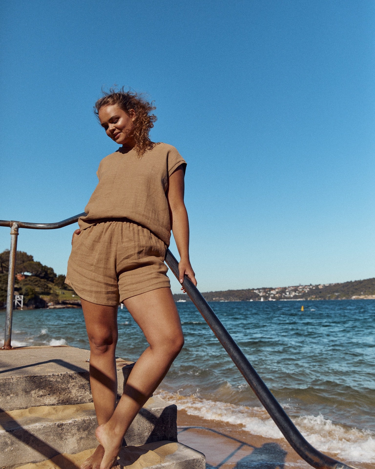 Easy to wear, effortless to style. The Tala short have been crafted from 100% pure cotton in a Sahara colour. Made for comfort and the transition of day to day life. Featuring an elastic waist band that can be worn higher for a high waisted look or pulled down for the right fit for you. Adorned with pockets either side these shorts are an everyday, easy and effortless go to pant.