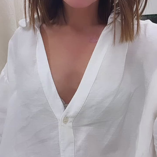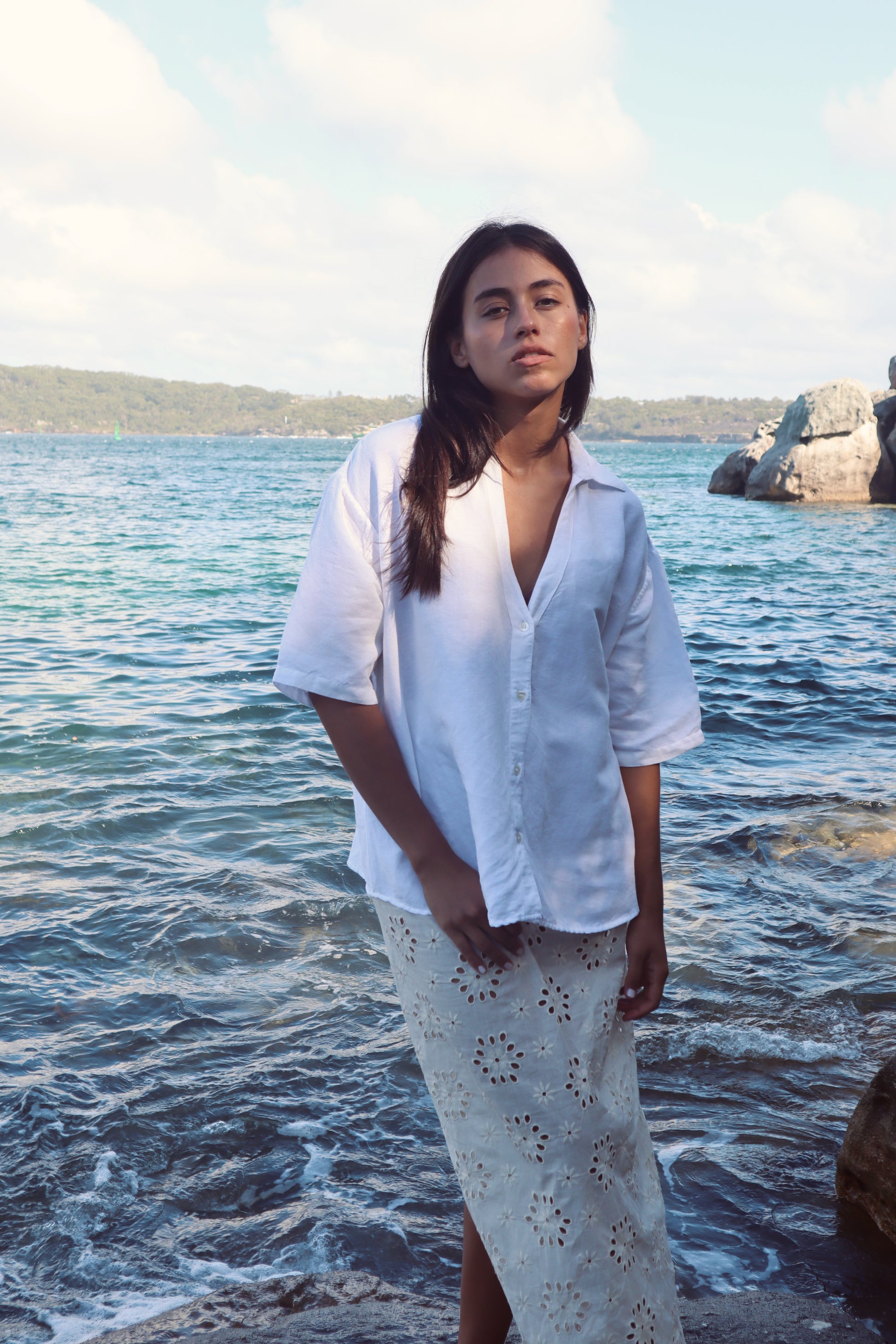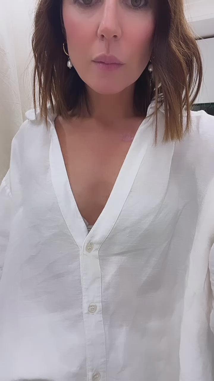 A refined essential with a modern twist. The William Shirt in crisp white is crafted from a breathable linen–TENCEL™ blend, offering a soft drape and natural texture. Designed with a reimagined low V neckline, dropped shoulders, and button-down front, it’s a fresh take on a timeless silhouette.